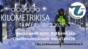 Talvikilometrikisa 2026 käydään aikavälillä 1.1.–28.2.2026. Mukaan voi ilmoittautua koko kisan ajan ja kilometrit (ja minuutit) voit merkitä myös takautuvasti! Joukkueen nimi on Kotkan Latu ja osallistumiskoodi on KoLaTalvi26. Joukkueeseen liittyminen tapahtuu nettisivulla https://www.kilometrikisa.fi/ [Lue lisää »]